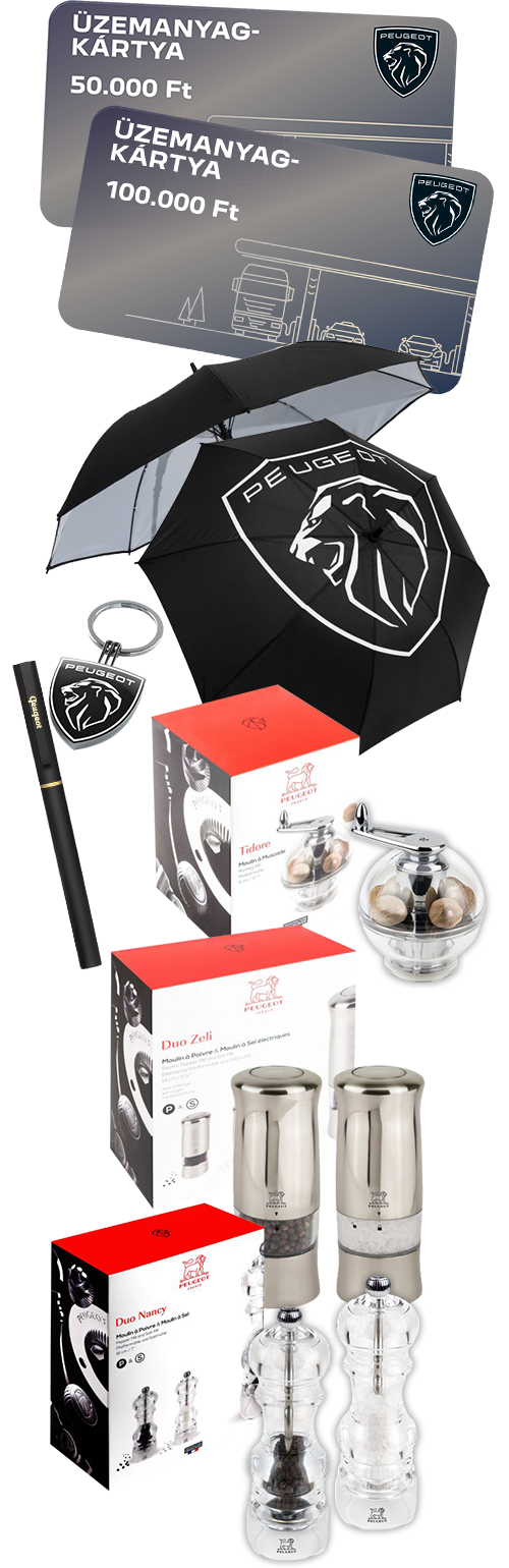 PEUGEOT logoval díszített butik termékek, összesen 150.000 Ft értékben: